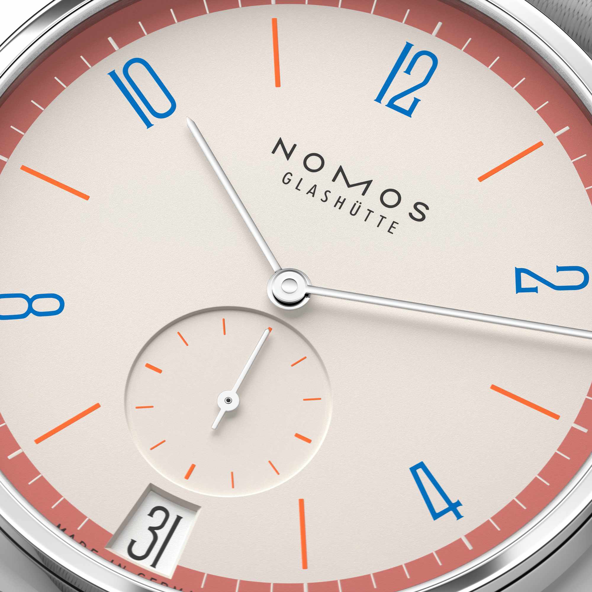 Minutenring ziegelrot, Datumshintergrund silberweiß