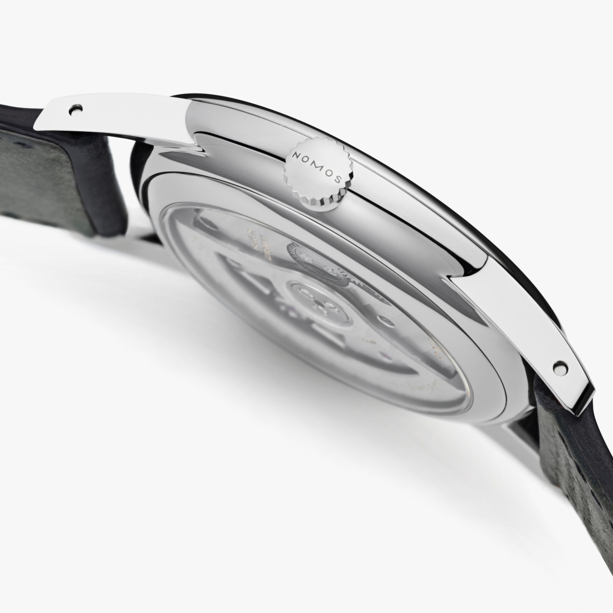 Glashütter Dreiviertelplatine; NOMOS-Unruhbrücke; 27 Rubine; beidseitig aufziehender Rotor; Incabloc-Stoßsicherung; NOMOS-Swing-System mit temperaturgebläuter