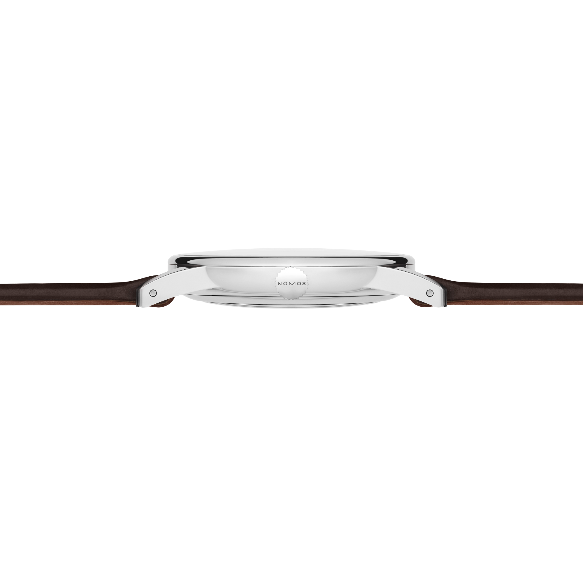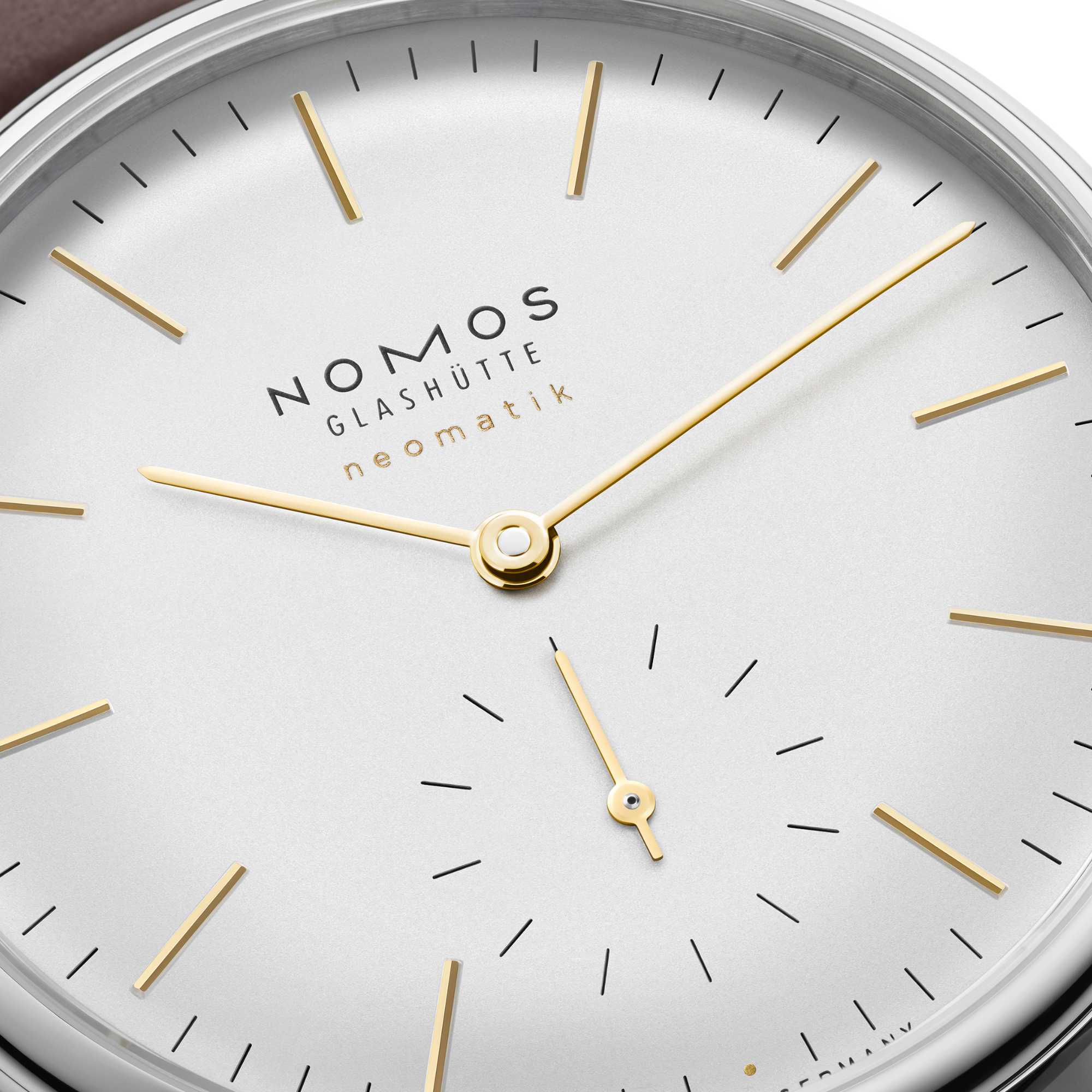 Ref. 397 - Diese Uhr macht glücklich. Nur mit etwas Gold bekleidet, den goldenen Zeigern und Stundenindexen, beschenkt Orion neomatik doré ihre Trägerin oder ihren Träger auf gelassene Weise mit ganz großer, beschwingter, mit echter und dauerhafter Eleganz. Die vornehm flache Automatik-Dresswatch in einem Edelstahlgehäuse in perfekter Linsenform repräsentiert Luxus in seiner souveränsten Form. Meisterliche Mechanik aus eigener Manufaktur in vollendet reduziertem Design – mit einer kleinen, aber entscheidenden Extravaganz.