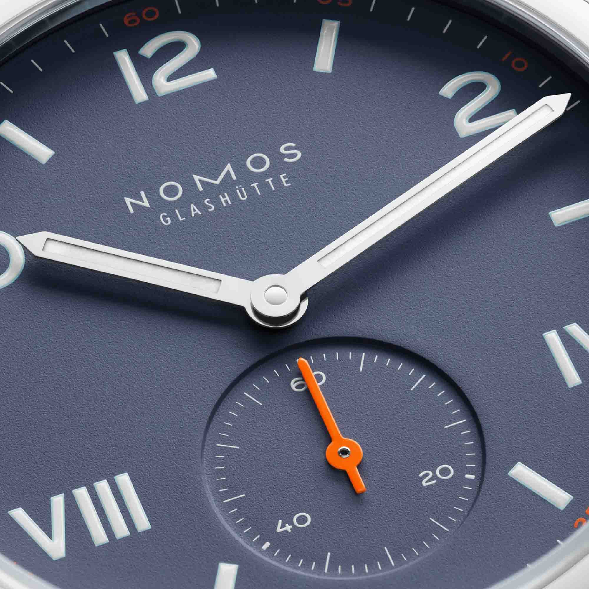 Zeiger rhodiniert, mit Superluminova weiß ausgelegt (blau nachleuchtend), Sekundenzeiger neonorange