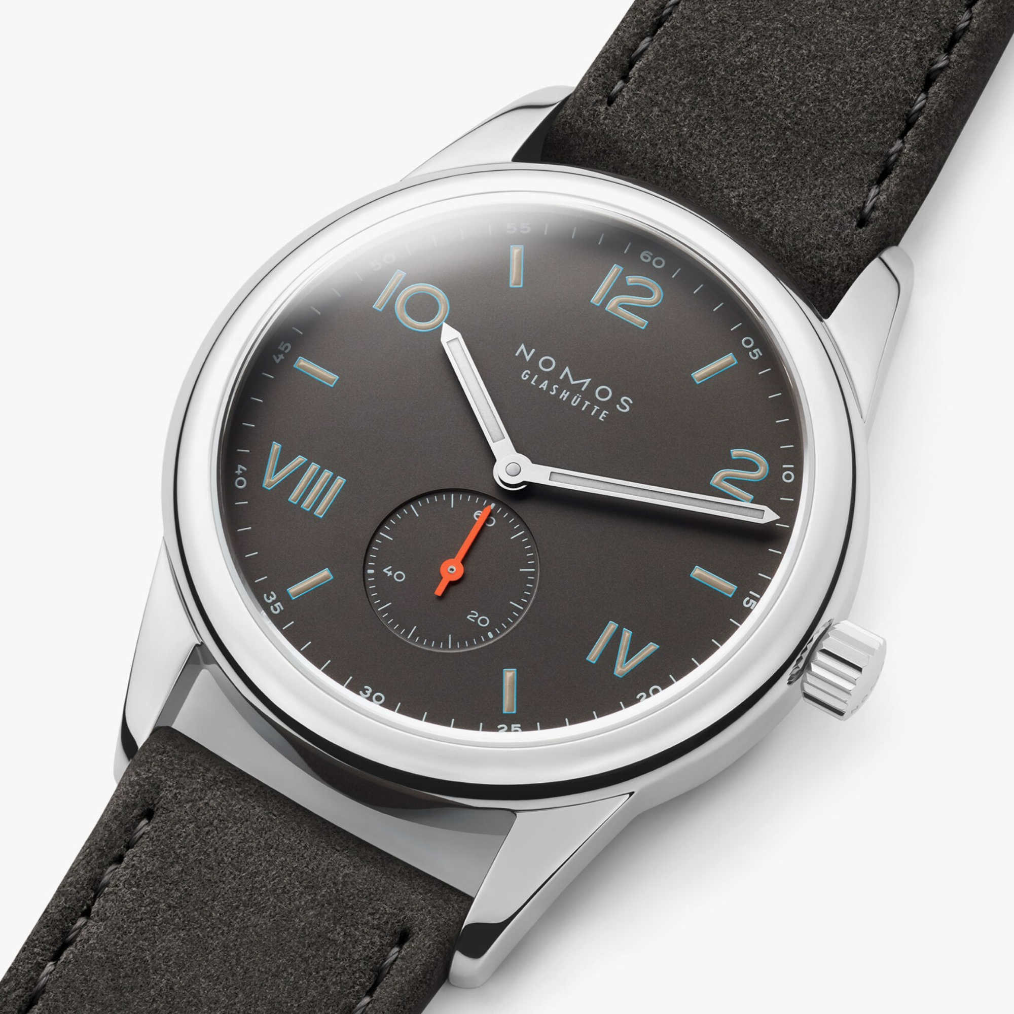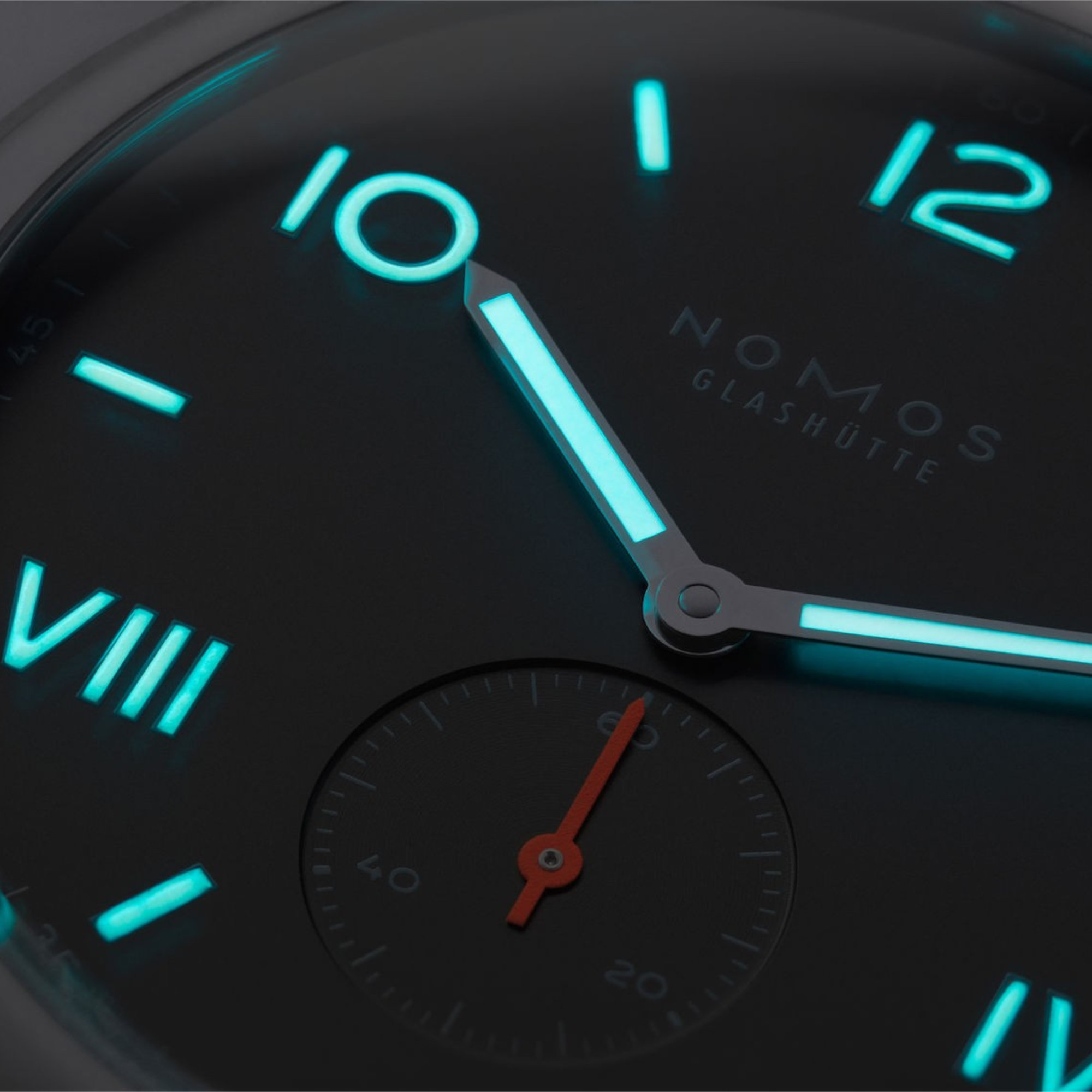 Zeiger: rhodiniert, mit Superluminova weiß ausgelegt (blau nachleuchtend), Sekundenzeiger neonorange