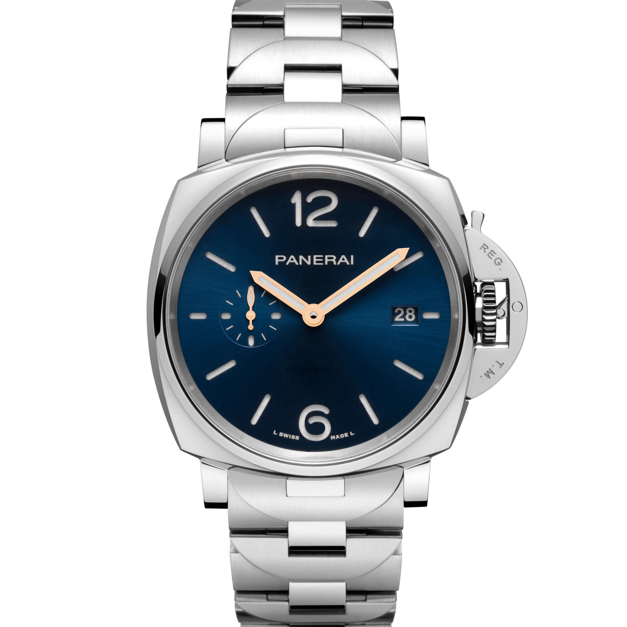Blau mit Sonnenschliff, fluoreszierenden arabischen Ziffern und Stundenmarkierungen