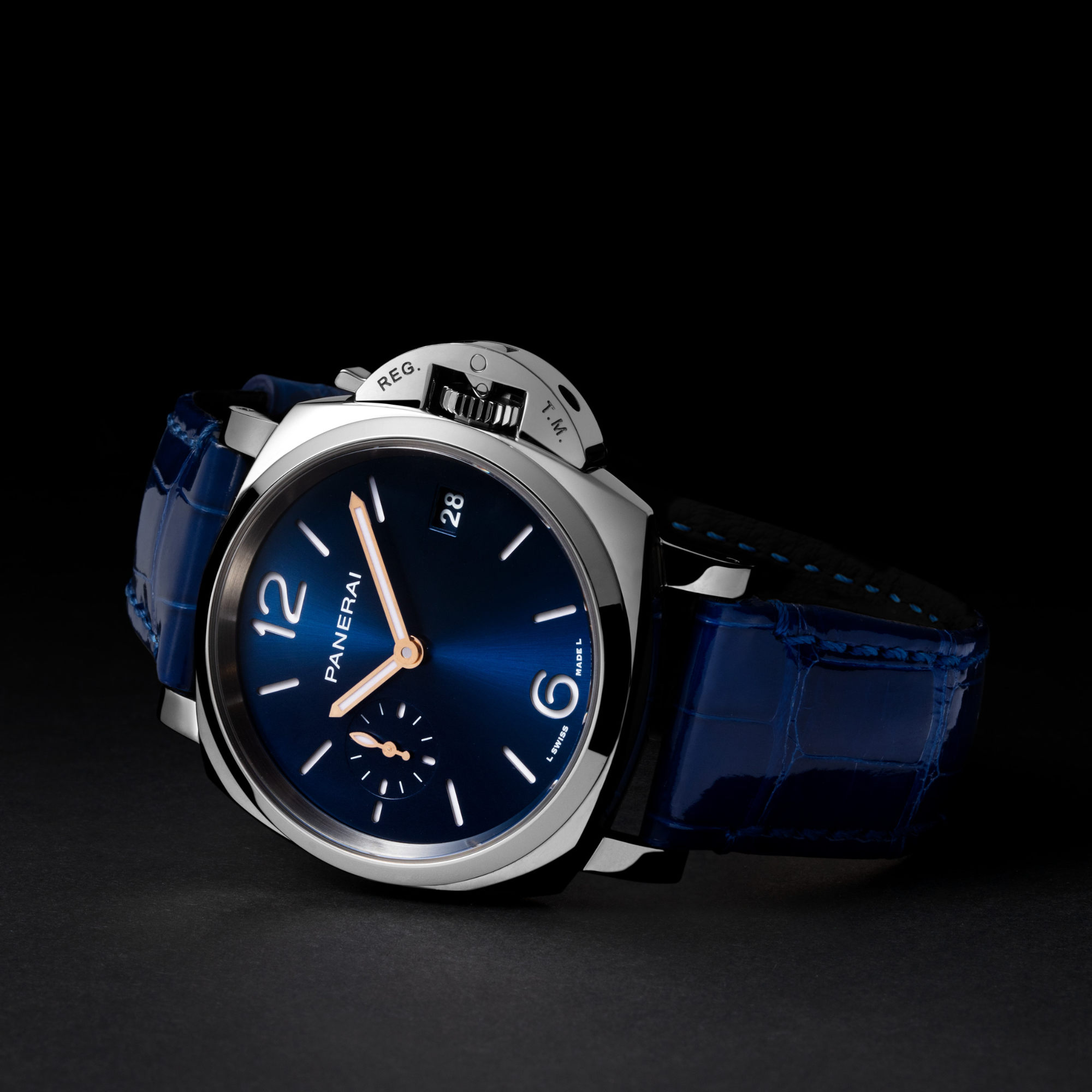 Blau mit Sonnenschliff, fluoreszierenden arabischen Ziffern, Index und Stundenmarkierungen