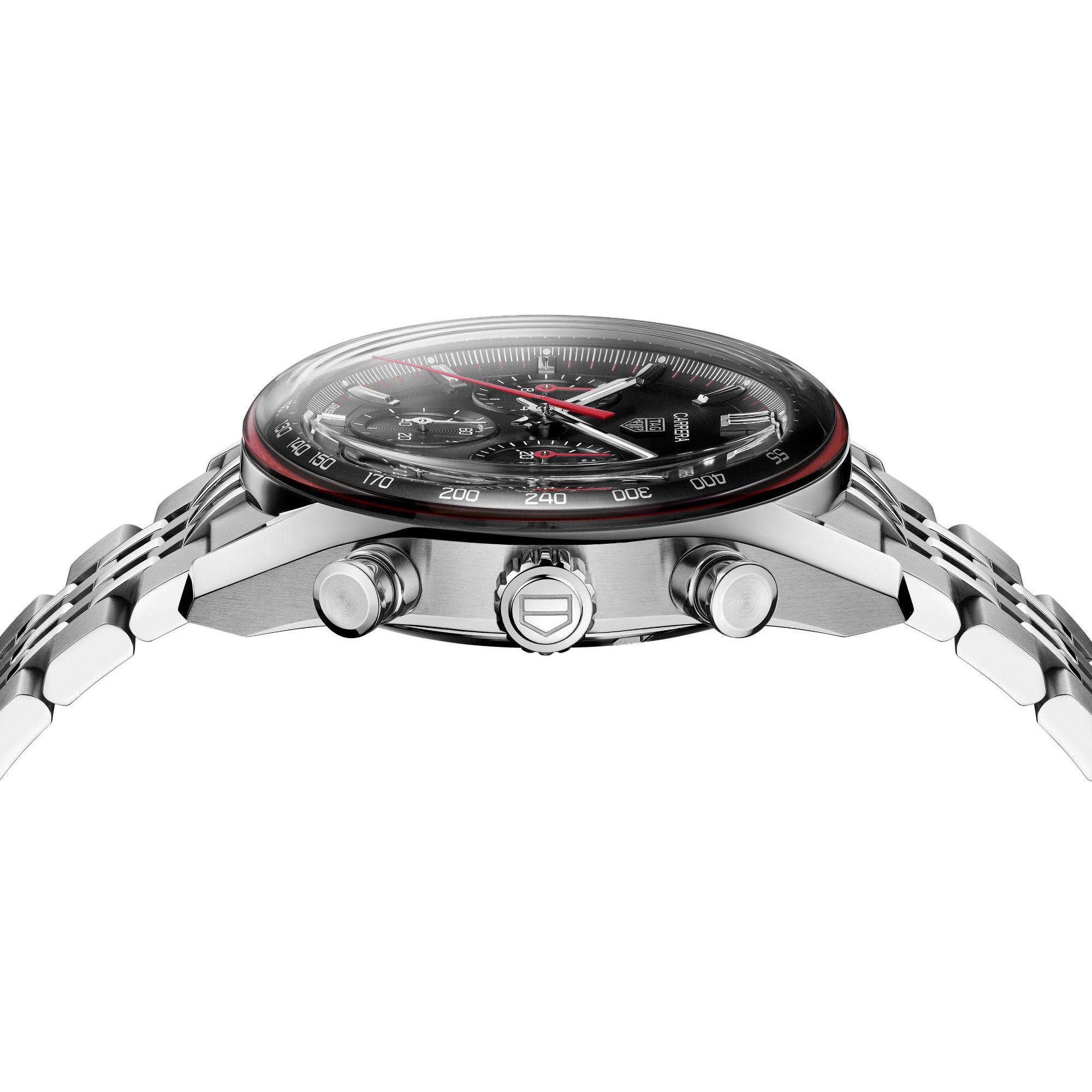 Ref. CBS2114.BA0053 - Dynamisch und gewagt: Dieser 41 mm große TAG Heuer Carrera Chronograph verkörpert die Rennsport-DNA der Maison durch ein auffälliges schwarzes Zifferblatt mit einem dezenten roten Außenring. Eine kühne Interpretation von Präzision und Kontrast, die das zeitlose Erbe des Motorsports in die Moderne überführt, angetrieben vom hauseigenen Calibre TH20-01 mit 80 Stunden Gangreserve.