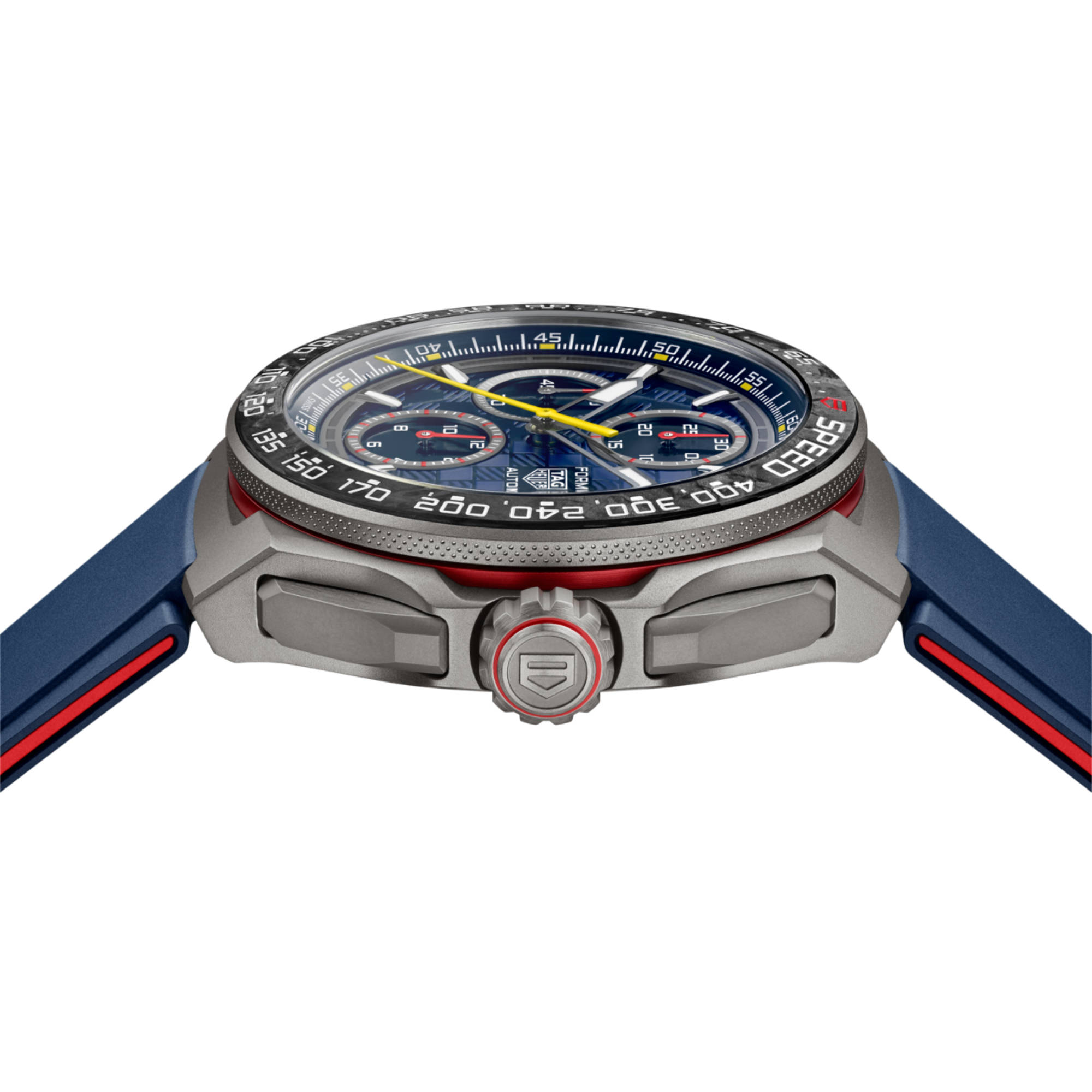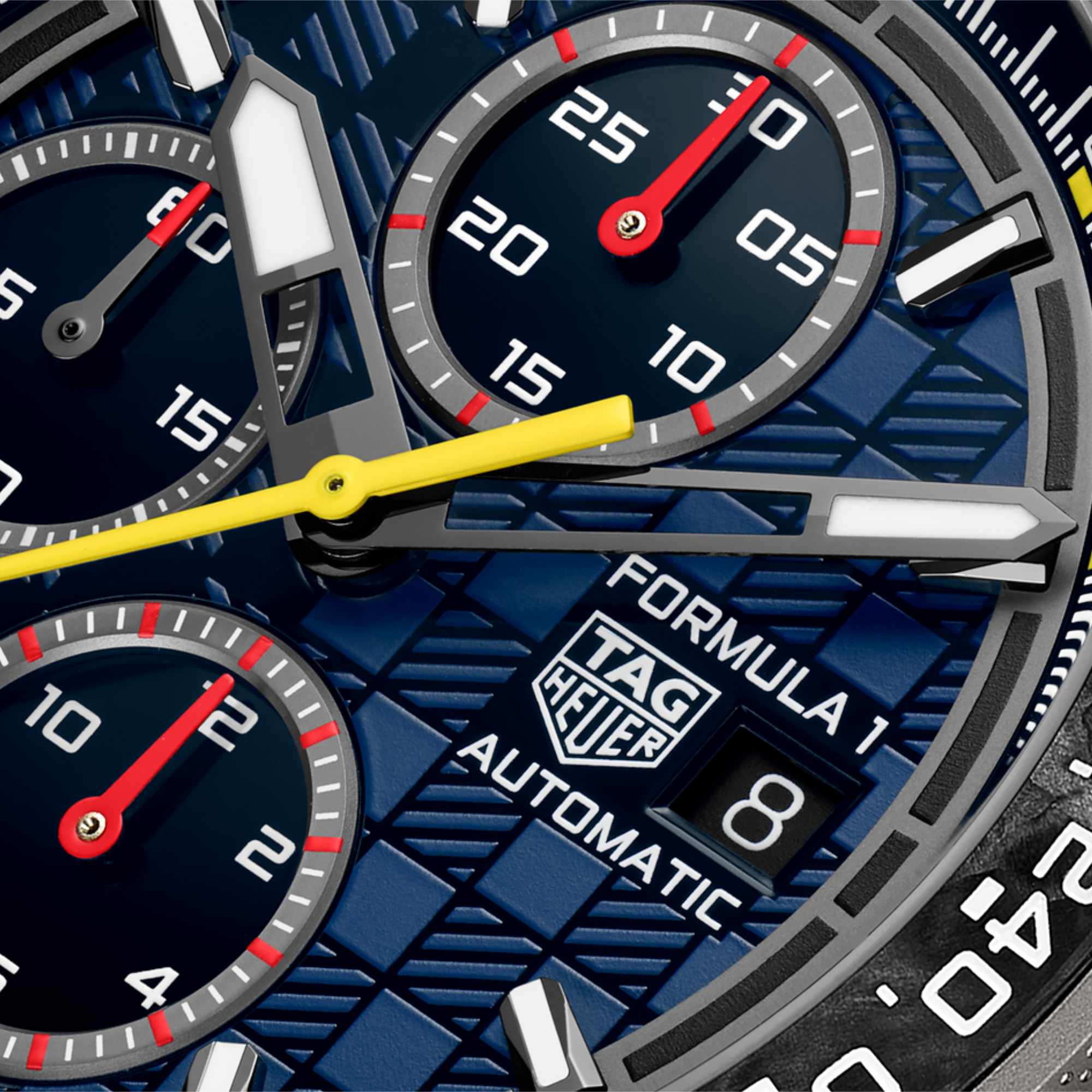 Ref. CBZ2080.FT8091 - TAG Heuer verleiht seiner Rennsport-DNA mit dem TAG Heuer Formula 1 Automatic Chronograph x Oracle Red Bull Racing Ausdruck. Dieser auffällige Zeitmesser ist eine Hommage an das Oracle Red Bull Racing Team und kombiniert dessen legendären Rennfarben mit modernsten Materialien. Das Ergebnis ist die ultimative vom Motorsport inspirierte Uhr.