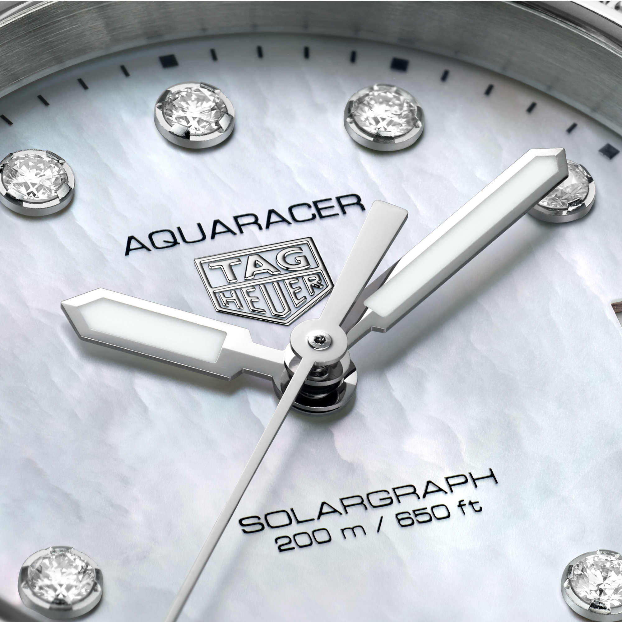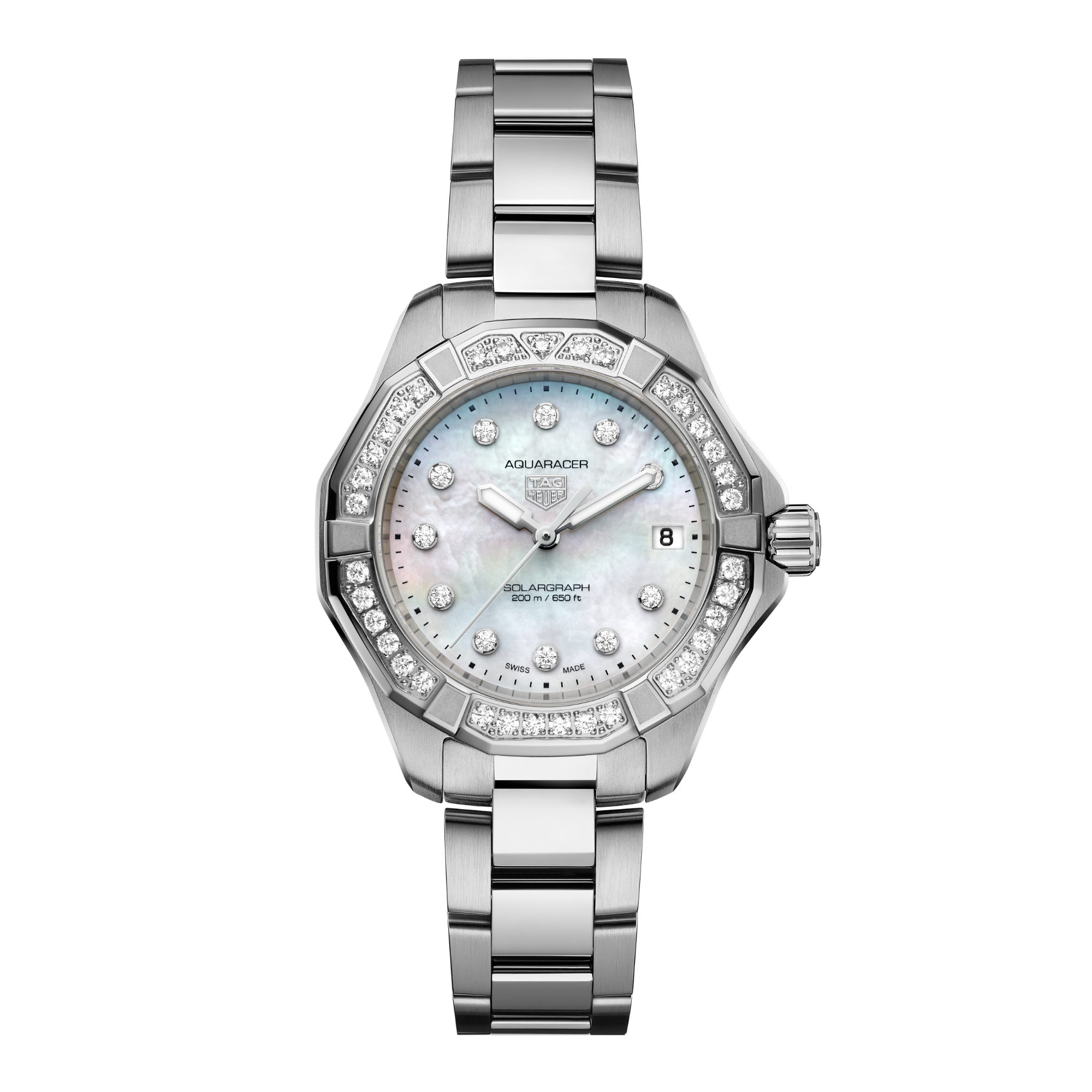 Ref. WBP1314.BA0005 - Fünfunddreißig funkelnde Diamanten (0,6 Karat) auf der Lünette und elf Diamanten (0,15 Karat) auf dem strahlenden Zifferblatt aus Perlmutt veredeln diese 34 mm große TAG Heuer Aquaracer. Das sorgfältig aus Edelstahl gefertigte Modell verbindet dauerhafte Widerstandsfähigkeit mit unvergleichlicher Raffinesse und ist bereit, sich jeder Herausforderung mit purer Eleganz zu stellen.